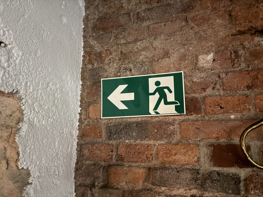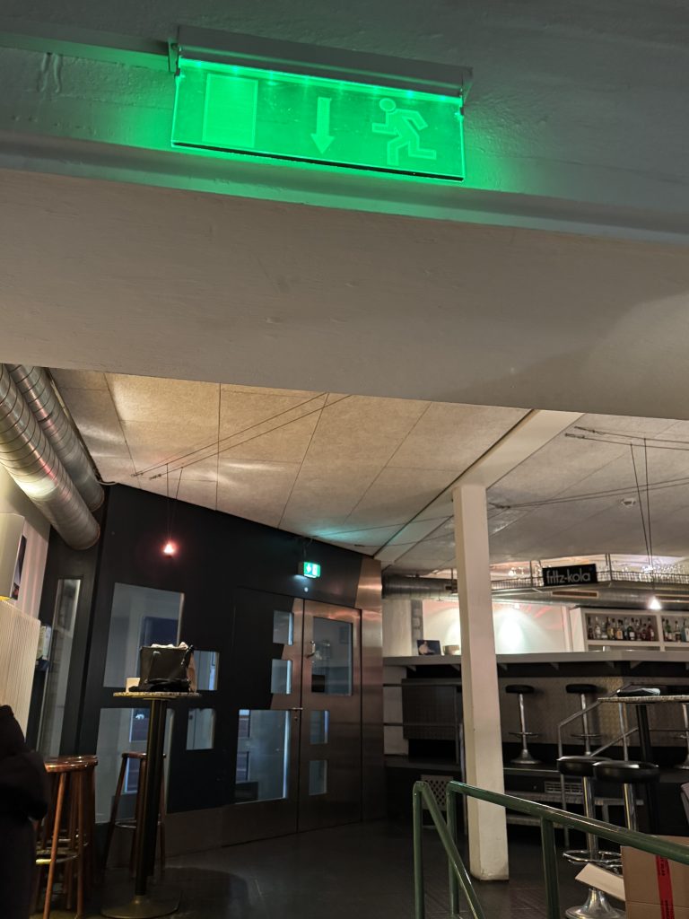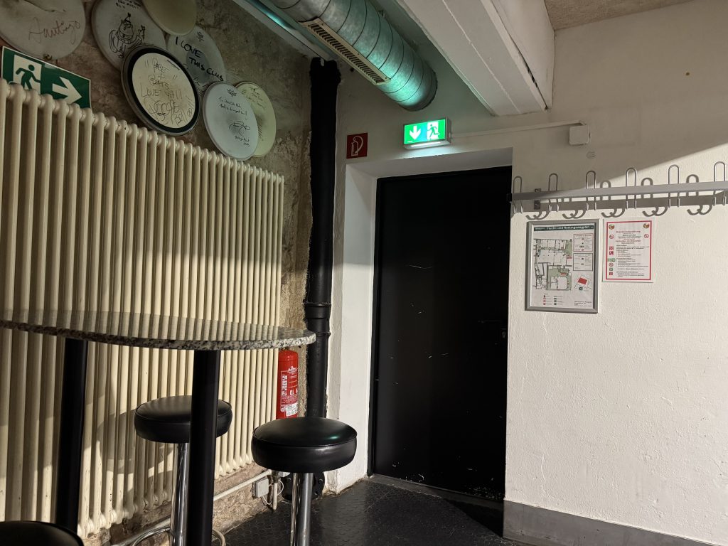 Das beginnt beim Technikpult, das im Alarmfall von der modernen Brandmeldeanlage ein optisches Signal zum sofortigen Stoppen der Musikverstärkung erhält. Dann sollen per Lautsprecherdurchsage Verhaltensanweisungen gegeben und es soll auf die Fluchtwege hingewiesen werden. Dafür existieren vorbereitete Sprechzettel. Andere Aktive sollen sich an die Notausgänge positionieren und die Evakuierung lenken, wiederum andere gegebenenfalls die in den Räumen verteilten Feuerlöscher einsetzen. Vor jeder einzelnen Veranstaltung haben die Verantwortlichen sich davon zu überzeugen, dass alle Notausgänge zugänglich und frei begehbar sind und die Notfall-Schließen auch wie vorgesehen öffnen.
